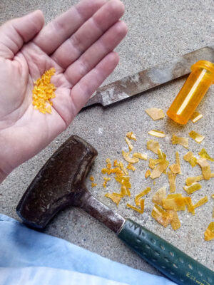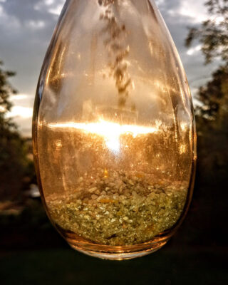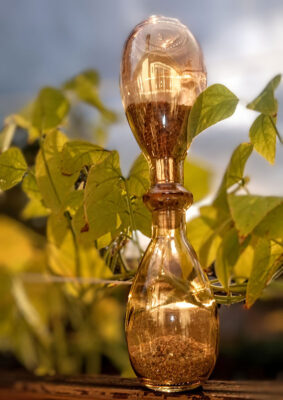 Alluvium is an hourglass filled with sand made from smashed fragments of symbolic objects. Each one carries a story of how women’s identities are eroded across time: a postcard for personal histories and voice, dried flowers for cycles of life, eggshells for body autonomy, a compact mirror for surveilled self-image, prescription bottles for control through systems and institutions, and iron filings for strength and endurance. Ground together, they form the residue of a lifetime.