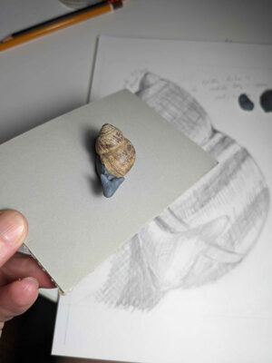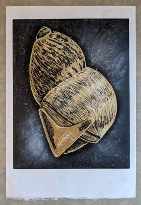 I crushed the shells and hammered the shards into the lino block to make indentations. For the second layer, I covered the snail with Mod Podge and used the shell shards to scrape it. Then I combined classic lino cutting with more hammering of crushed shells into the lino block.